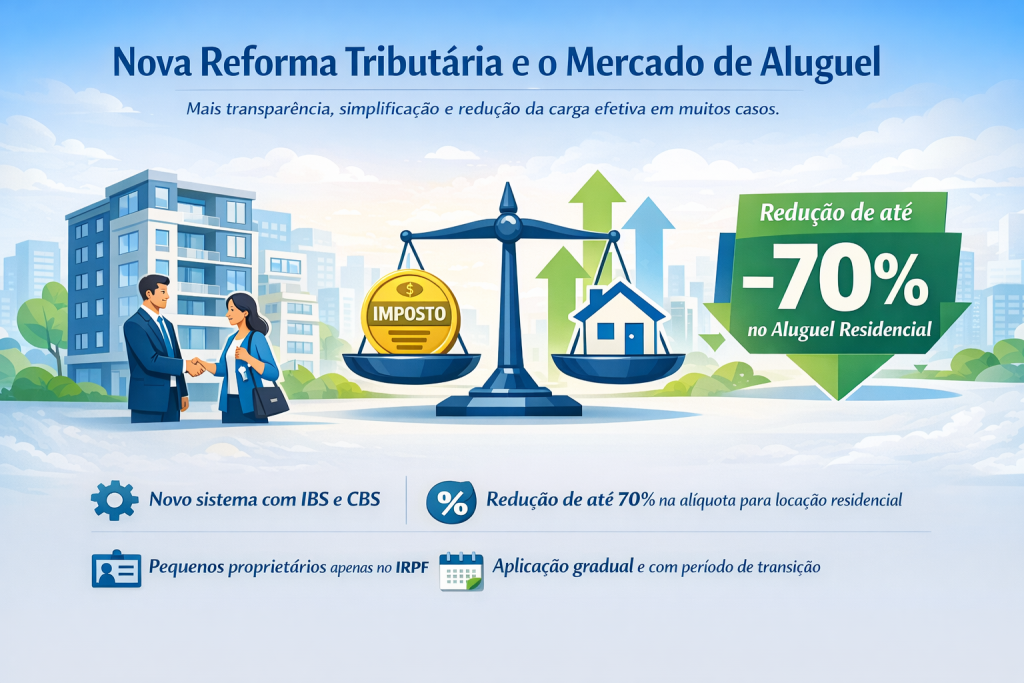 O Art. 260, prevê um Redutor Social aplicável exclusivamente às locações residenciais, no valor de R$ 600,00 por imóvel. Redutor social na locação residencial. Exemplo prático: Aluguel residencial: R$ 2.000,00 Aplica-se o redutor: R$ 600,00 Base tributável: R$ 1.400,00 IBS e CBS incidem sobre R$ 1.400,00, e não sobre o valor total do aluguel.